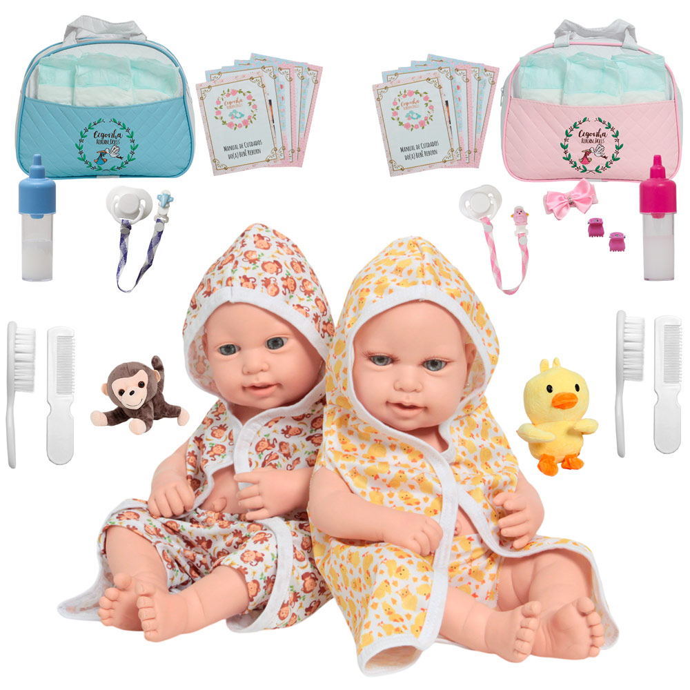Bebê Reborn Gêmeos Casal Roupão Com Bolsa Vários Itens