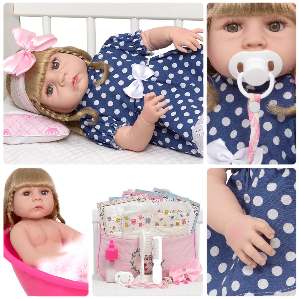 Boneca Bebê Reborn Menina Loira Vestido Bolinha Kit Completo