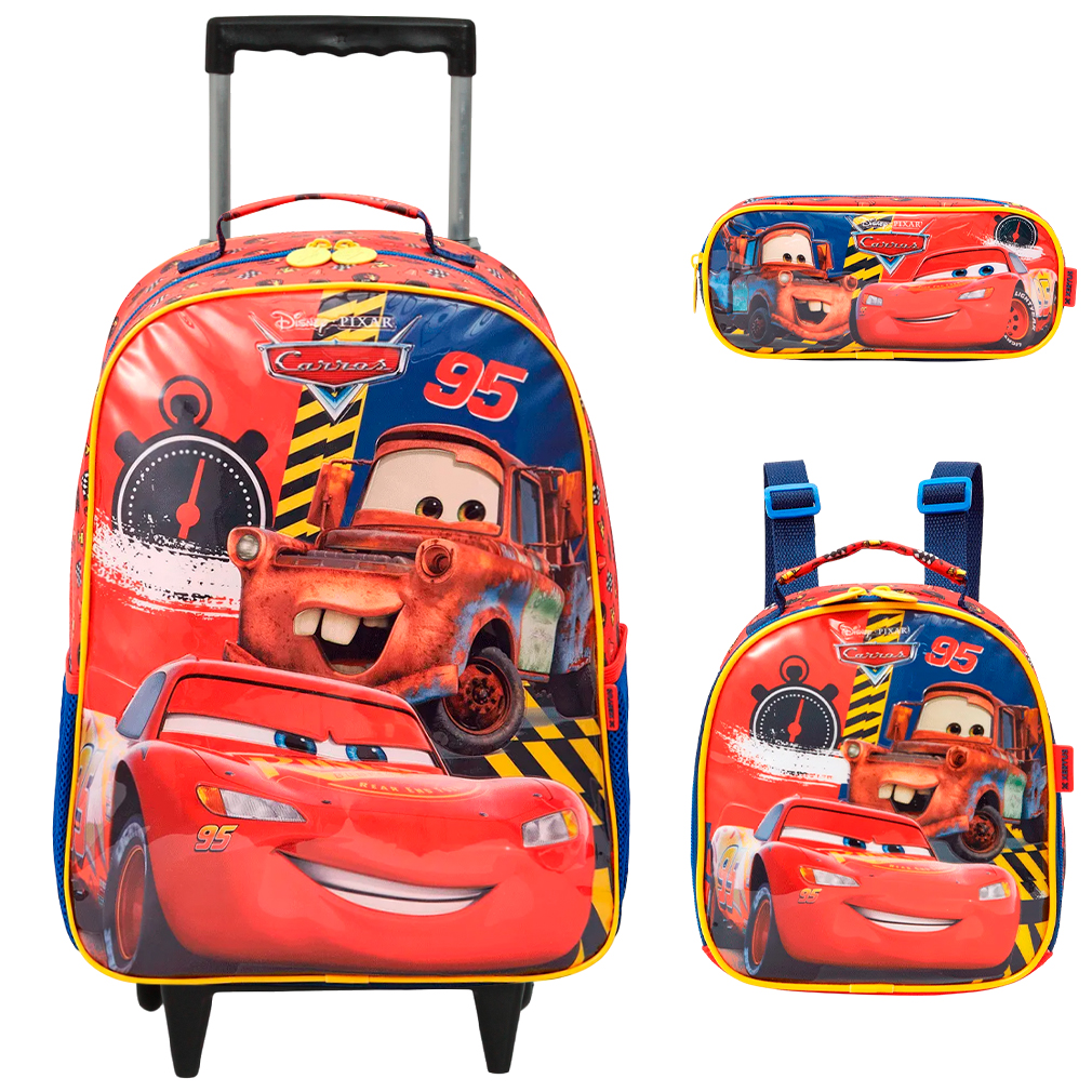 Kit Mochila Escolar Infantil Carros Rodinhas, acompanha lancheira e estojo. Possui alça de mão reforçada. Agora você pode levar sua mochila no seu dia a dia ou acompanhar você na escola. Sua abertura maior se dá por zíper com puxador. Na parte de dentro possui amplo espaço para a guardar diversos materiais como cadernos, livros e estojos. Na parte da frente, possui bolso com zíper para a guardar pertences de menor tamanho e bolsos laterais.