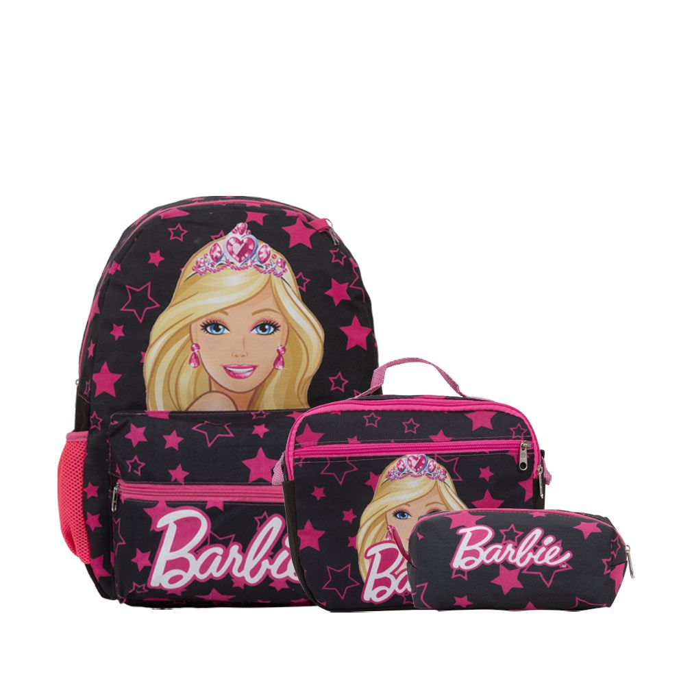 Kit Mochila Escolar Infantil Barbie, acompanha lancheira e estojo. Possui alça de mão reforçada. Agora você pode levar sua mochila no seu dia a dia ou acompanhar você na escola. Sua abertura maior se dá por zíper com puxador. Na parte de dentro possui amplo espaço para a guardar diversos materiais como cadernos, livros e estojos. Na parte da frente, possui bolso com zíper para a guardar pertences de menor tamanho e bolsos laterais.