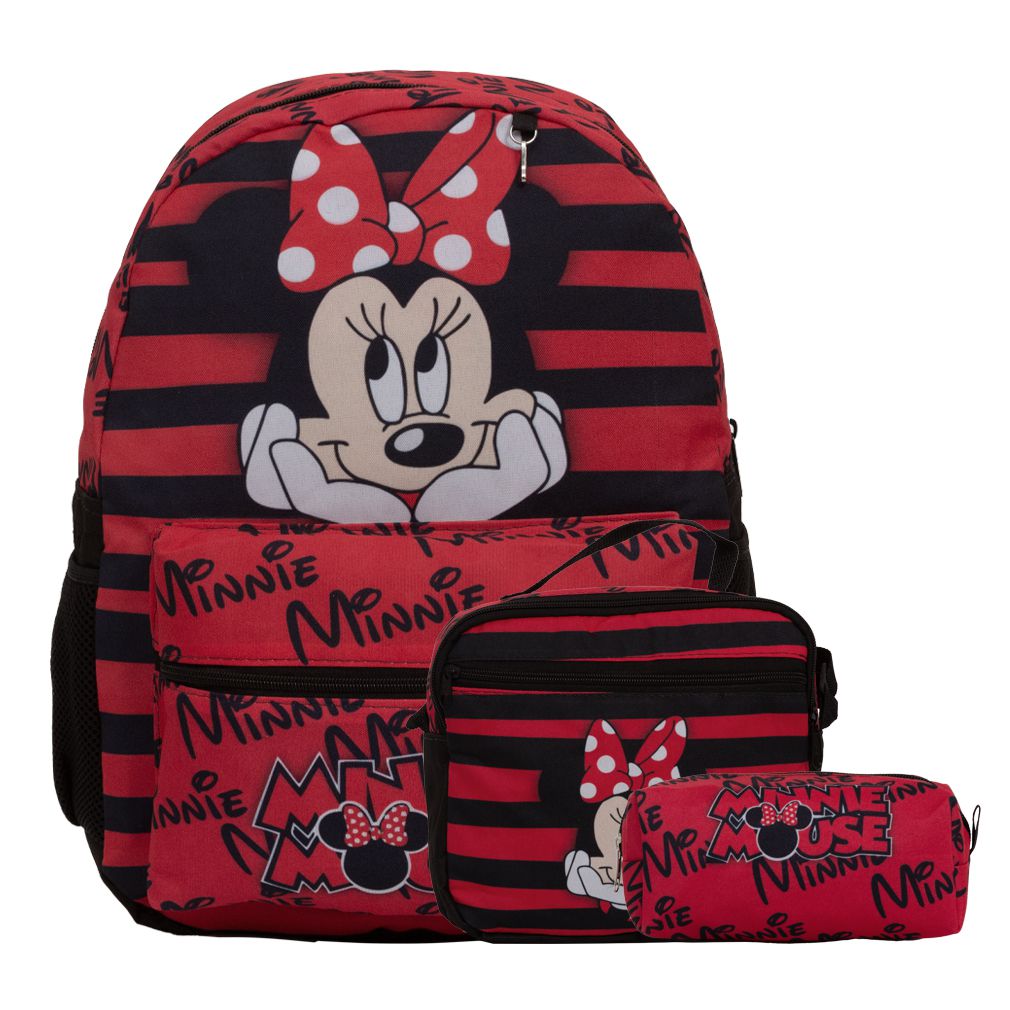Kit Mochila Escolar Infantil Minnie, acompanha lancheira e estojo. Possui alça de mão reforçada. Agora você pode levar sua mochila no seu dia a dia ou acompanhar você na escola. Sua abertura maior se dá por zíper com puxador. Na parte de dentro possui amplo espaço para a guardar diversos materiais como cadernos, livros e estojos. Na parte da frente, possui bolso com zíper para a guardar pertences de menor tamanho e bolsos laterais.