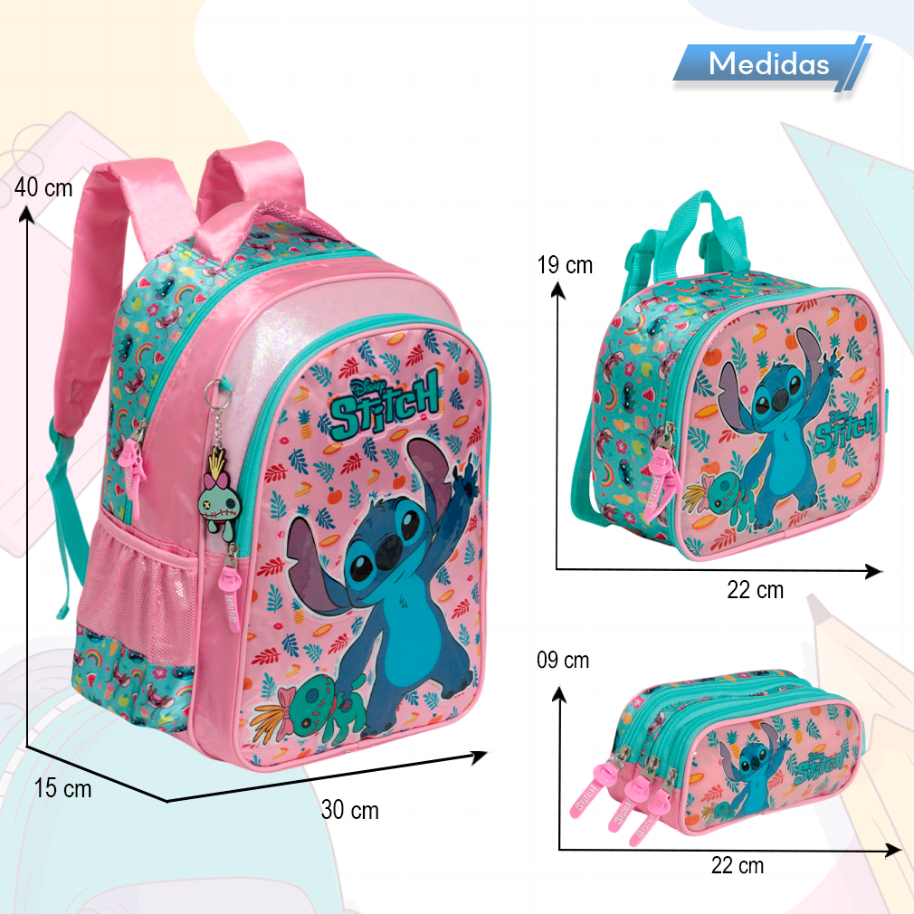 Kit Mochila Escolar Infantil Stitch, acompanha lancheira e estojo. Possui alça de mão reforçada. Agora você pode levar sua mochila no seu dia a dia ou acompanhar você na escola. Sua abertura maior se dá por zíper com puxador. Na parte de dentro possui amplo espaço para a guardar diversos materiais como cadernos, livros e estojos. Na parte da frente, possui bolso com zíper para a guardar pertences de menor tamanho e bolsos laterais.