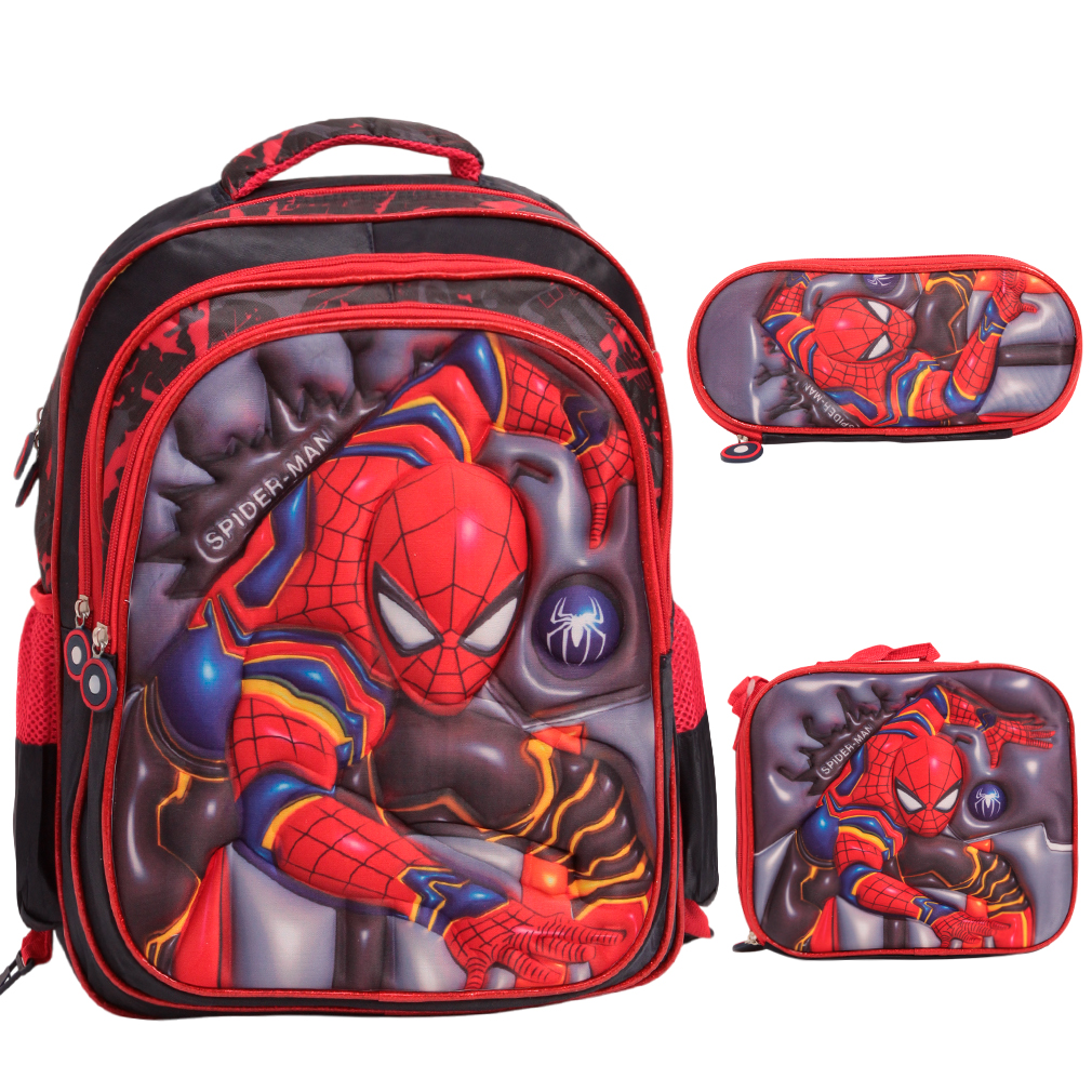 Kit Mochila Escolar Infantil Homem Aranha, acompanha lancheira e estojo. Possui alça de mão reforçada. Agora você pode levar sua mochila no seu dia a dia ou acompanhar você na escola. Sua abertura maior se dá por zíper com puxador. Na parte de dentro possui amplo espaço para a guardar diversos materiais como cadernos, livros e estojos. Na parte da frente, possui bolso com zíper para a guardar pertences de menor tamanho e bolsos laterais.