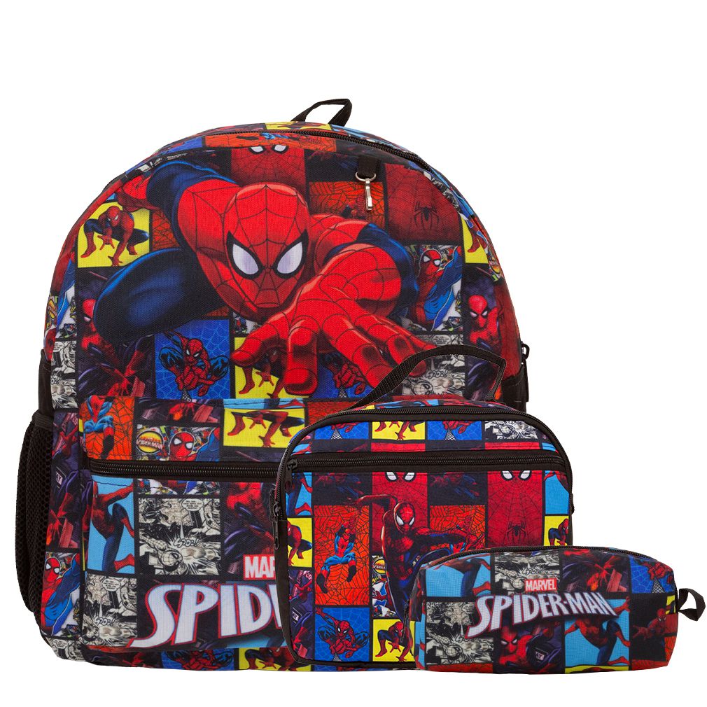 Kit Mochila Escolar Infantil Homem Aranha, acompanha lancheira e estojo. Possui alça de mão reforçada. Agora você pode levar sua mochila no seu dia a dia ou acompanhar você na escola. Sua abertura maior se dá por zíper com puxador. Na parte de dentro possui amplo espaço para a guardar diversos materiais como cadernos, livros e estojos. Na parte da frente, possui bolso com zíper para a guardar pertences de menor tamanho e bolsos laterais.