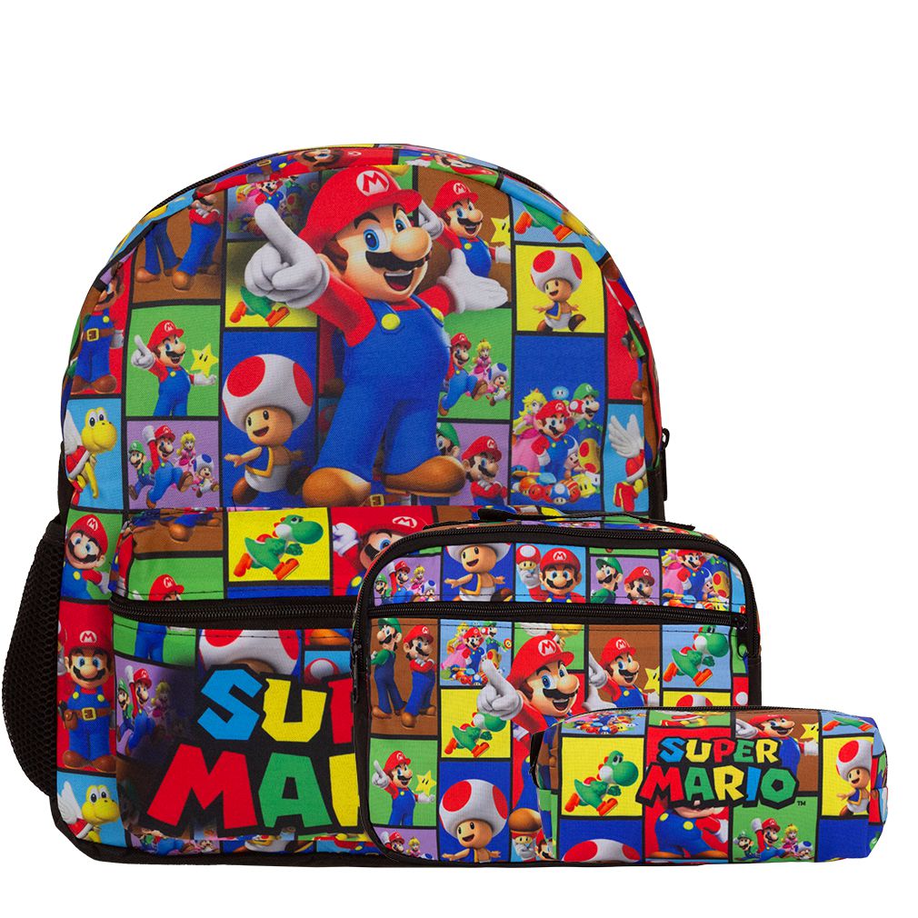 Kit Mochila Escolar Infantil Super Mario, acompanha lancheira e estojo. Possui alça de mão reforçada. Agora você pode levar sua mochila no seu dia a dia ou acompanhar você na escola. Sua abertura maior se dá por zíper com puxador. Na parte de dentro possui amplo espaço para a guardar diversos materiais como cadernos, livros e estojos. Na parte da frente, possui bolso com zíper para a guardar pertences de menor tamanho e bolsos laterais.