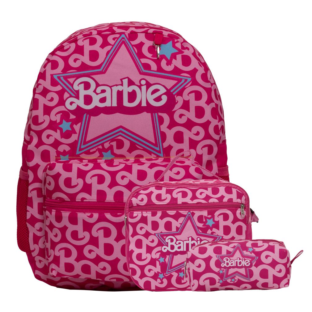Kit Mochila Escolar Infantil Barbie, acompanha lancheira e estojo. Possui alça de mão reforçada. Agora você pode levar sua mochila no seu dia a dia ou acompanhar você na escola. Sua abertura maior se dá por zíper com puxador. Na parte de dentro possui amplo espaço para a guardar diversos materiais como cadernos, livros e estojos. Na parte da frente, possui bolso com zíper para a guardar pertences de menor tamanho e bolsos laterais.