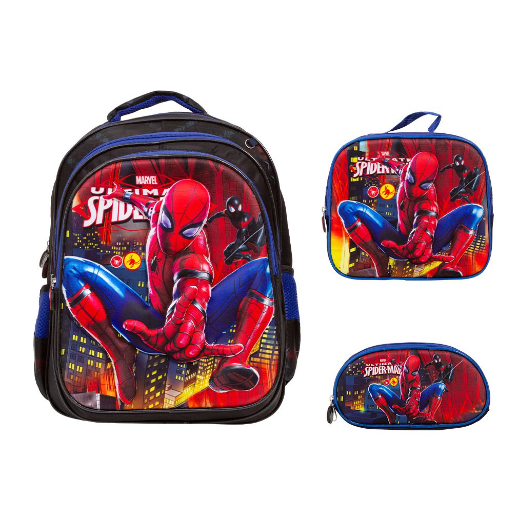Kit Mochila Escolar Infantil Homem Aranha, acompanha lancheira e estojo. Possui alça de mão reforçada. Agora você pode levar sua mochila no seu dia a dia ou acompanhar você na escola. Sua abertura maior se dá por zíper com puxador. Na parte de dentro possui amplo espaço para a guardar diversos materiais como cadernos, livros e estojos. Na parte da frente, possui bolso com zíper para a guardar pertences de menor tamanho e bolsos laterais.