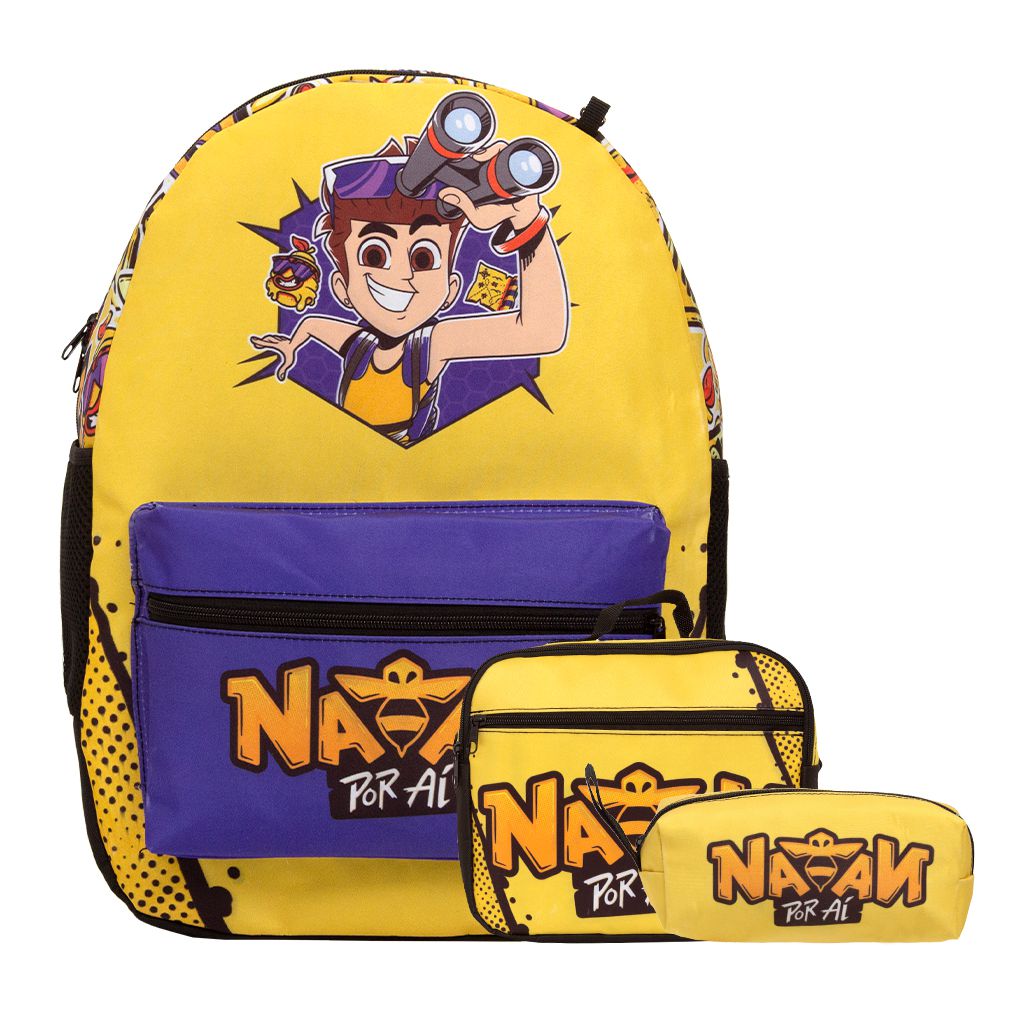 Kit Mochila Escolar Infantil Natan Por Aí, acompanha lancheira e estojo. Possui alça de mão reforçada. Agora você pode levar sua mochila no seu dia a dia ou acompanhar você na escola. Sua abertura maior se dá por zíper com puxador. Na parte de dentro possui amplo espaço para a guardar diversos materiais como cadernos, livros e estojos. Na parte da frente, possui bolso com zíper para a guardar pertences de menor tamanho e bolsos laterais.