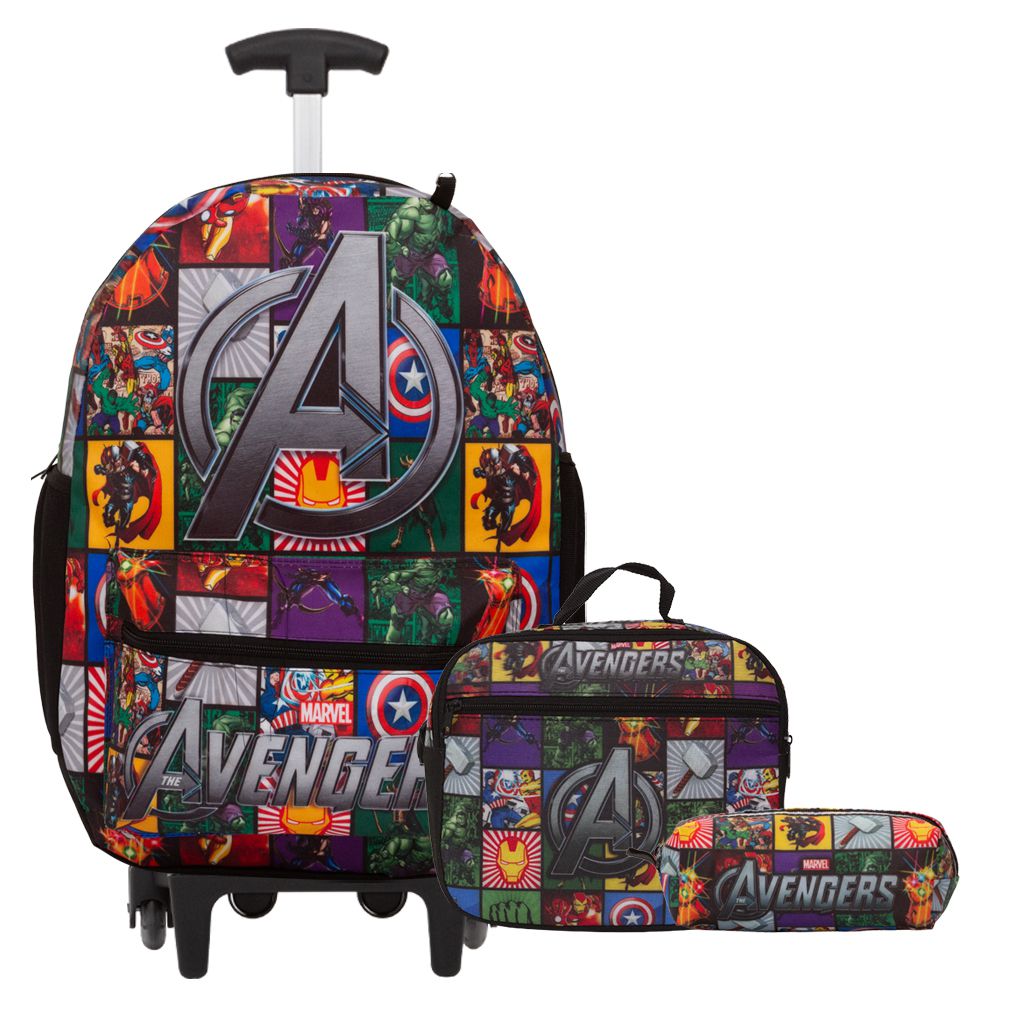 Kit Mochila Escolar Infantil Vingadores Rodinhas, acompanha lancheira e estojo. Possui alça de mão reforçada. Agora você pode levar sua mochila no seu dia a dia ou acompanhar você na escola. Sua abertura maior se dá por zíper com puxador. Na parte de dentro possui amplo espaço para a guardar diversos materiais como cadernos, livros e estojos. Na parte da frente, possui bolso com zíper para a guardar pertences de menor tamanho e bolsos laterais.