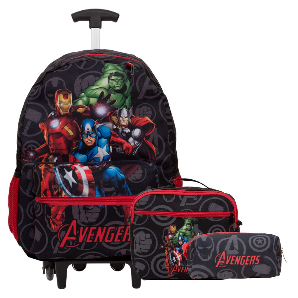 Kit Mochila Escolar Infantil Vingadores Rodinha, acompanha lancheira e estojo. Possui alça de mão reforçada. Agora você pode levar sua mochila no seu dia a dia ou acompanhar você na escola. Sua abertura maior se dá por zíper com puxador. Na parte de dentro possui amplo espaço para a guardar diversos materiais como cadernos, livros e estojos. Na parte da frente, possui bolso com zíper para a guardar pertences de menor tamanho e bolsos laterais.