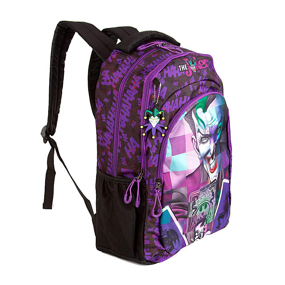 Mochila Juvenil Coringa The Joker Roxa de Costa. Agora você pode levar sua mochila Coringa The Joker no seu dia a dia ou acompanhar você na escola. Possui alça de mão reforçada. Sua abertura maior se dá por zíper com puxador personalizado. Na parte de dentro possui amplo espaço para guardar diversos materiais como cadernos grandes, livros e estojos. Na parte da frente, possui bolso com zíper personalizado para guardar pertences de menor tamanho.