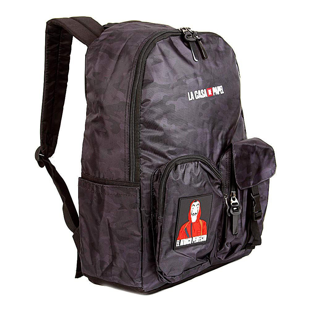Mochila Juvenil La Casa de Papel Camuflado Preta de Costa. Agora você pode levar sua mochila La Casa de Papel no seu dia a dia ou acompanhar você na escola. Possui alça de mão reforçada. Sua abertura maior se dá por zíper com puxador personalizado. Na parte de dentro possui amplo espaço para guardar diversos materiais como cadernos grandes, livros e estojos. Na parte da frente, possui bolso com zíper personalizado para guardar pertences de menor tamanho.