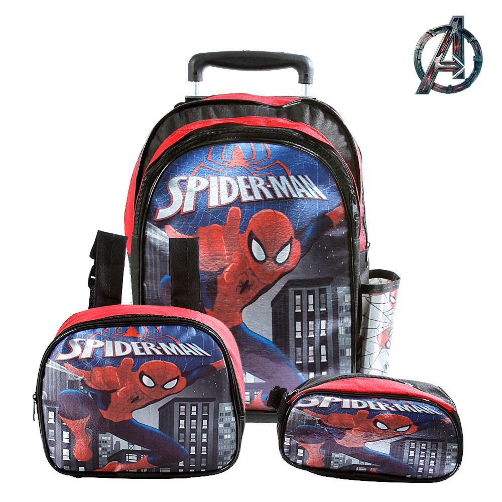Kit Mochila Escolar Infantil Homem Aranha Com Rodinhas, acompanha lancheira e estojo. Agora pode levar sua mochila no seu dia a dia ou acompanhar você na escola. Possui alça de mão reforçada. Sua abertura maior se dá por zíper com puxador. Na parte de dentro possui amplo espaço para a guardar diversos materiais como cadernos, livros e estojos. Na parte da frente, possui bolso com zíper para a guardar pertences de menor tamanho, e bolsos laterais.
