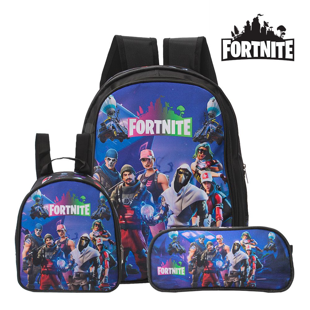 Kit Mochila Escolar Infantil Jogo Fortnite De Costas, acompanha lancheira e estojo. Possui alça de mão reforçada. Agora você pode levar sua mochila no seu dia a dia ou acompanhar você na escola. Sua abertura maior se dá por zíper com puxador. Na parte de dentro possui amplo espaço para a guardar diversos materiais como cadernos, livros e estojos. Na parte da frente, possui bolso com zíper para a guardar pertences de menor tamanho e bolsos laterais.