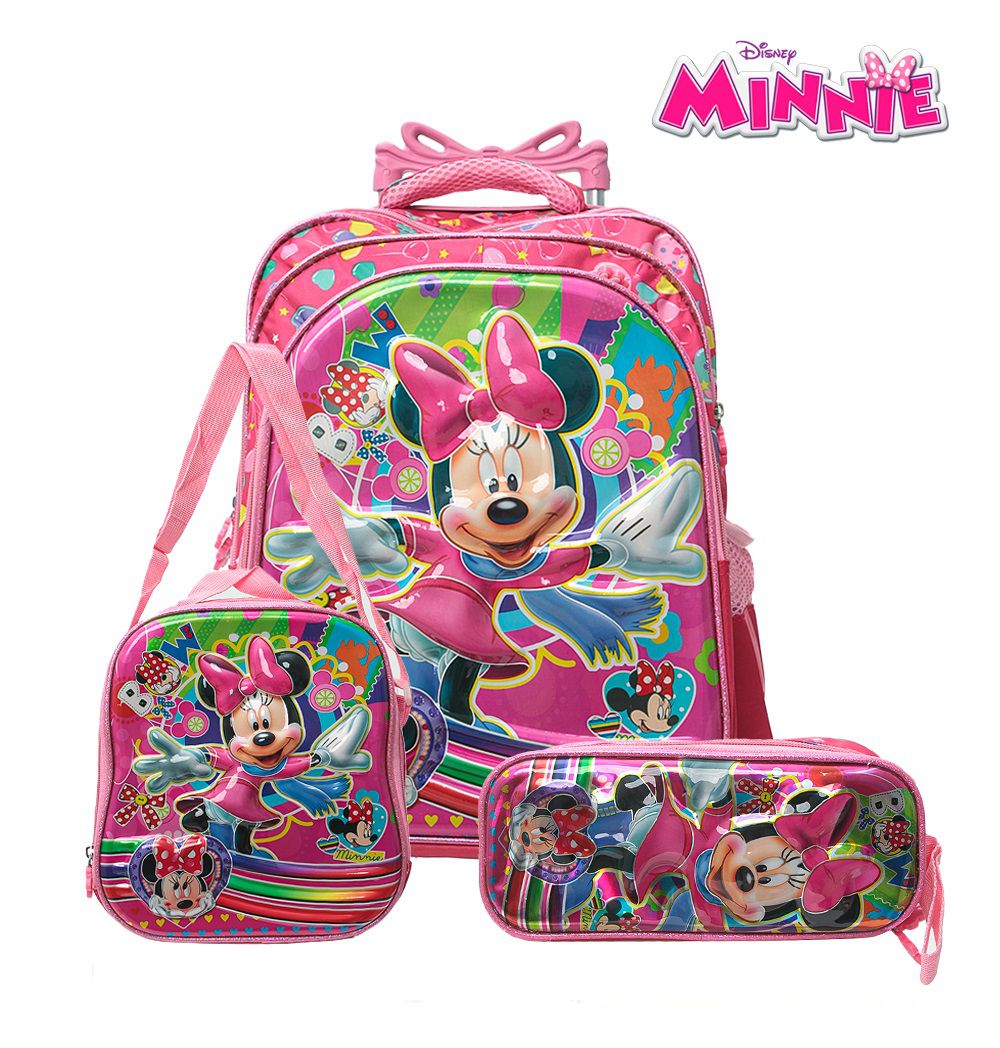 Kit Mochila Escolar Infantil Minnie Mouse 3D Com Rodinhas, acompanha lancheira e estojo. Agora pode levar sua mochila no seu dia a dia ou acompanhar você na escola. Possui alça de mão reforçada. Sua abertura maior se dá por zíper com puxador. Na parte de dentro possui amplo espaço para a guardar diversos materiais como cadernos, livros e estojos. Na parte da frente, possui bolso com zíper para a guardar pertences de menor tamanho, e bolsos laterais.