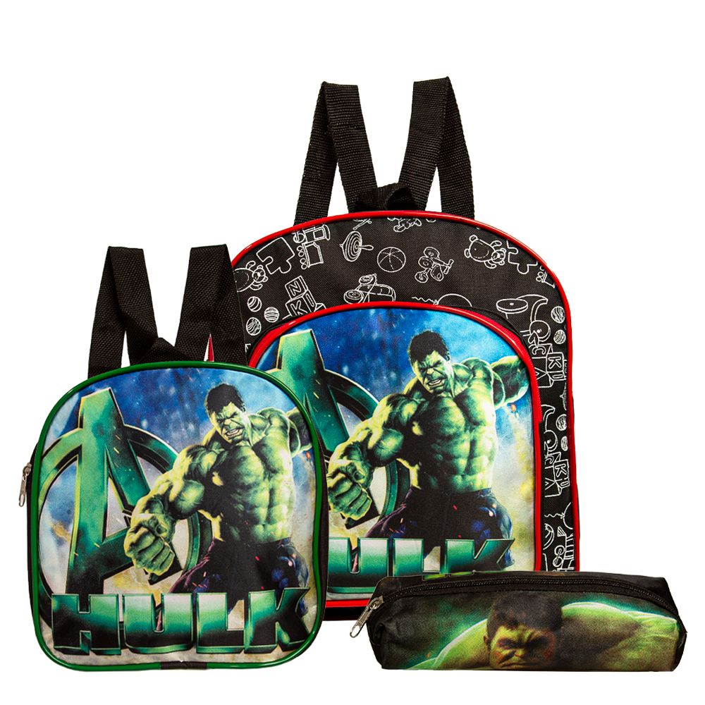 Kit Mochila Escolar Infantil Pequena do Hulk De Costas, acompanha lancheira e estojo. Possui alça de mão reforçada. Agora você pode levar sua mochila no seu dia a dia ou acompanhar você na escola. Sua abertura maior se dá por zíper com puxador. Na parte de dentro possui espaço para a guardar diversos materiais como cadernos, livros e estojos. Na parte da frente, possui bolso com zíper para a guardar pertences de menor tamanho.