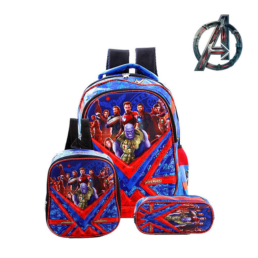 Kit Mochila Escolar Infantil De Costas Avengers Guerra Infinita, acompanha lancheira e estojo. Super-heróis que serão capazes de defender a Terra de ameaças sem precedentes, Homem de Ferro, Capitão América, Thor, Viúva Negra, Doutor Estranho, Gamora formam o time dos sonhos com seu inimigo Thanos.