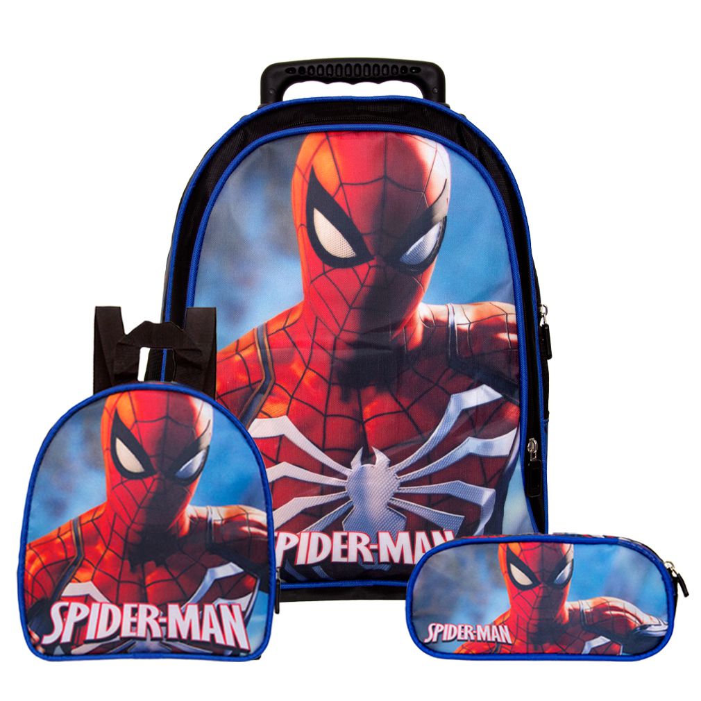 Kit Mochila Escolar Infantil Homem Aranha 3D Spider Man Com Rodinhas , acompanha lancheira e estojo. Agora você pode levar sua mochila do Homem Aranha no seu dia a dia ou acompanhar você na escola. Possui alça de mão reforçada. Sua abertura maior se dá por zíper com puxador. Na parte de dentro possui amplo espaço para a guardar diversos materiais como cadernos, livros e estojos. Na parte da frente, possui bolso com zíper para a guardar pertences de menor tamanho, e bolsos laterais.