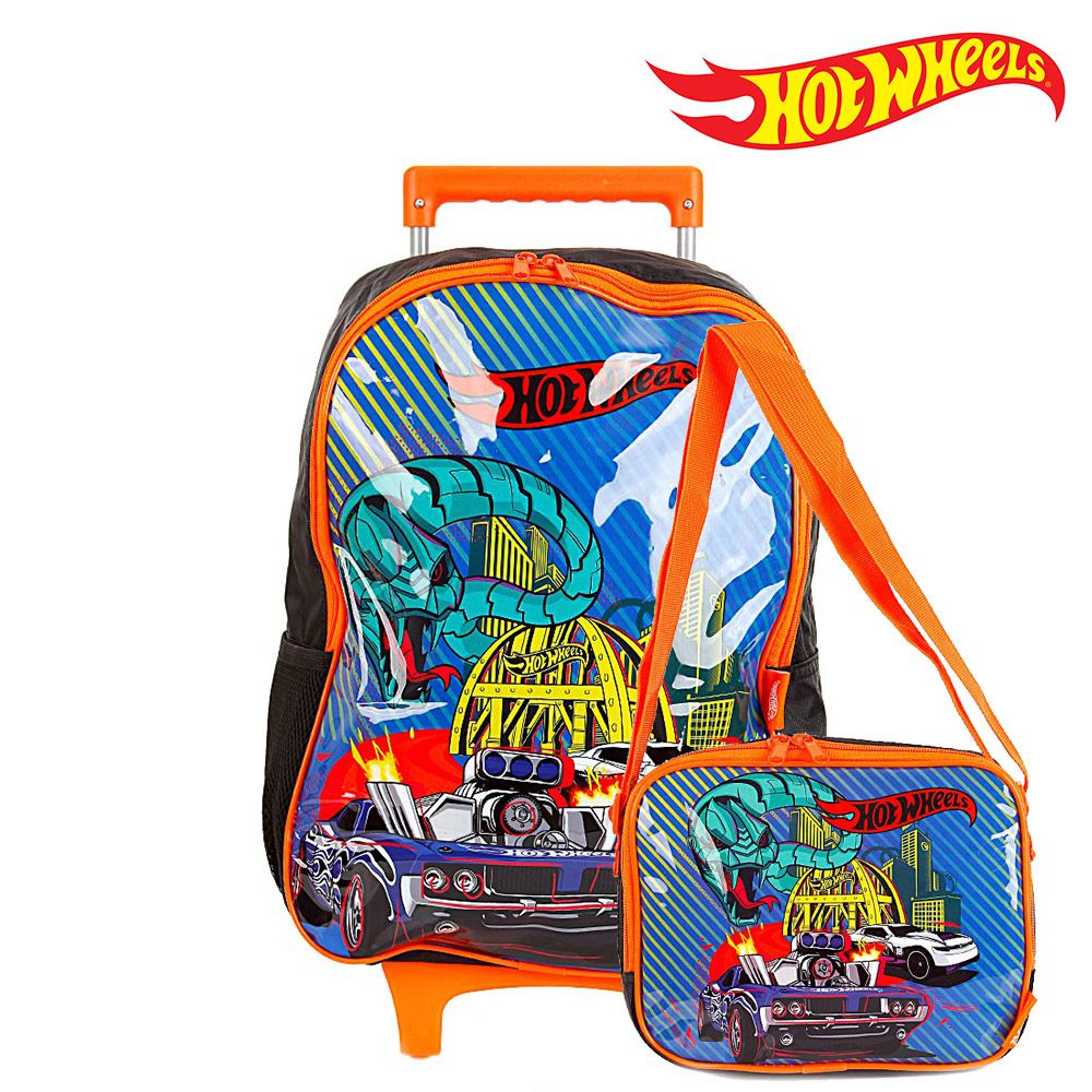 Kit Mochila Escolar Infantil hot wheels Com Rodinhas, acompanha lancheira e estojo. Agora você pode levar sua mochila hot wheels no seu dia a dia ou acompanhar você na escola. Possui alça de mão reforçada. Sua abertura maior se dá por zíper. Na parte de dentro possui amplo espaço para guardar diversos materiais como cadernos grandes, livros, estojos e bolsos laterais.