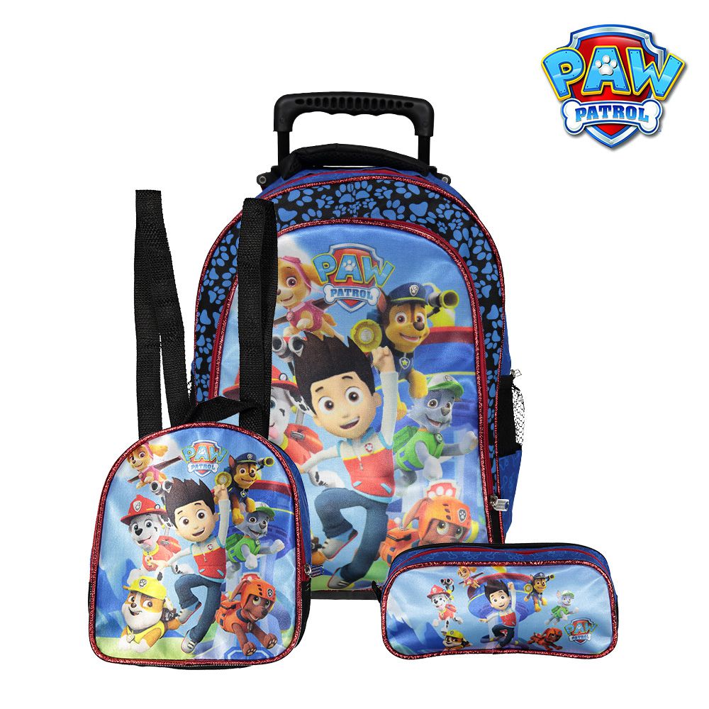 Kit Mochila Escolar Infantil Patrulha Canina de Rodinhas, acompanha lancheira e estojo. Agora você pode levar sua mochila da Patrulha Canina no seu dia a dia ou acompanhar você na escola. Possui alça de mão reforçada. Sua abertura maior se dá por zíper com puxador. Na parte de dentro possui amplo espaço para a guardar diversos materiais como cadernos, livros e estojos. Na parte da frente, possui bolso com zíper para a guardar pertences de menor tamanho, e bolsos laterais.