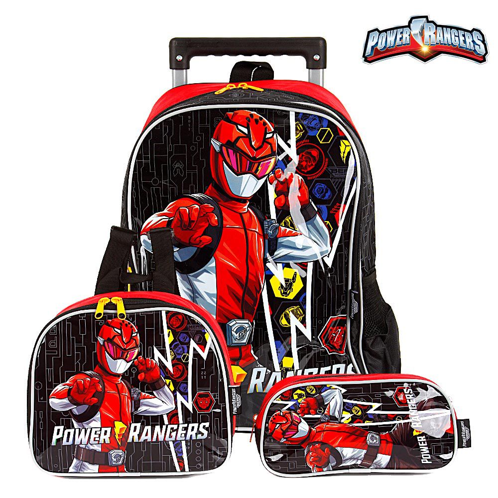 Kit Mochila Escolar Infantil Power Rangers Com Rodinhas, acompanha lancheira e estojo. Agora você pode levar sua mochila do Power Rangers no seu dia a dia ou acompanhar você na escola. Possui alça de mão reforçada. Sua abertura maior se dá por zíper. Na parte de dentro possui amplo espaço para guardar diversos materiais como cadernos grandes, livros e estojos. Na parte da frente, possui bolso com zíper para guardar pertences de menor tamanho, e bolsos laterais.