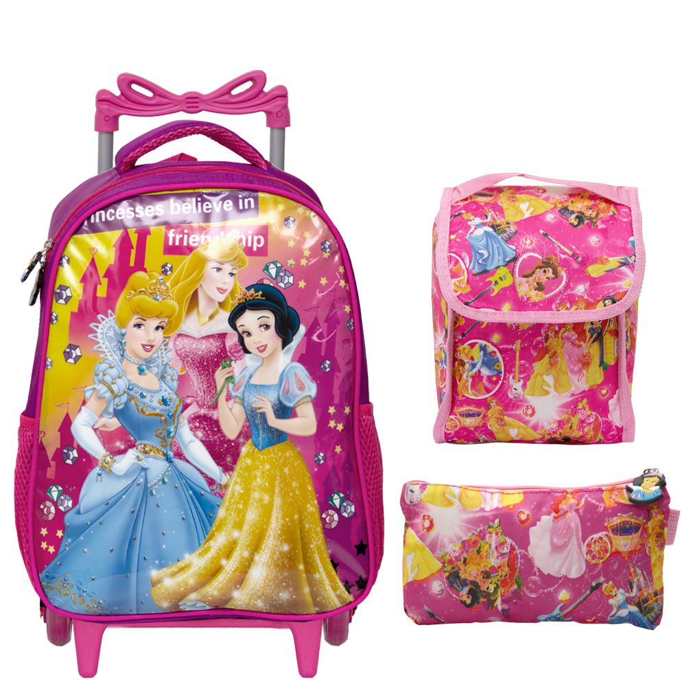 Kit Mochila Escolar Infantil Princesas Disney com Rodinhas, acompanha lancheira e estojo. Agora você pode levar sua mochila das Princesas Disney no seu dia a dia ou acompanhar você na escola.