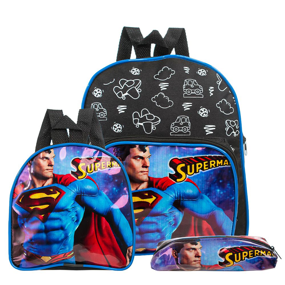 Kit Mochila Escolar Infantil Super Man Costas, acompanha lancheira e estojo. Possui alça de mão reforçada. Agora você pode levar sua mochila no seu dia a dia ou acompanhar você na escola. Sua abertura maior se dá por zíper com puxador. Na parte de dentro possui amplo espaço para a guardar diversos materiais como cadernos, livros e estojos. Na parte da frente, possui bolso com zíper para a guardar pertences de menor tamanho.
