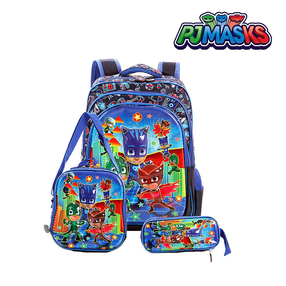 Kit Mochila Infantil Escolar 3D de Costas PJ Masks, acompanha lancheira e estojo. Possui alça de mão reforçada. Sua abertura maior se da por zíper com puxador. Na parte de dentro possui amplo espaço para a guardar diversos materiais como cadernos, livros e estojos. Na parte da frente, possui bolso com zíper para a guardar pertences de menor tamanho e bolsos laterais.