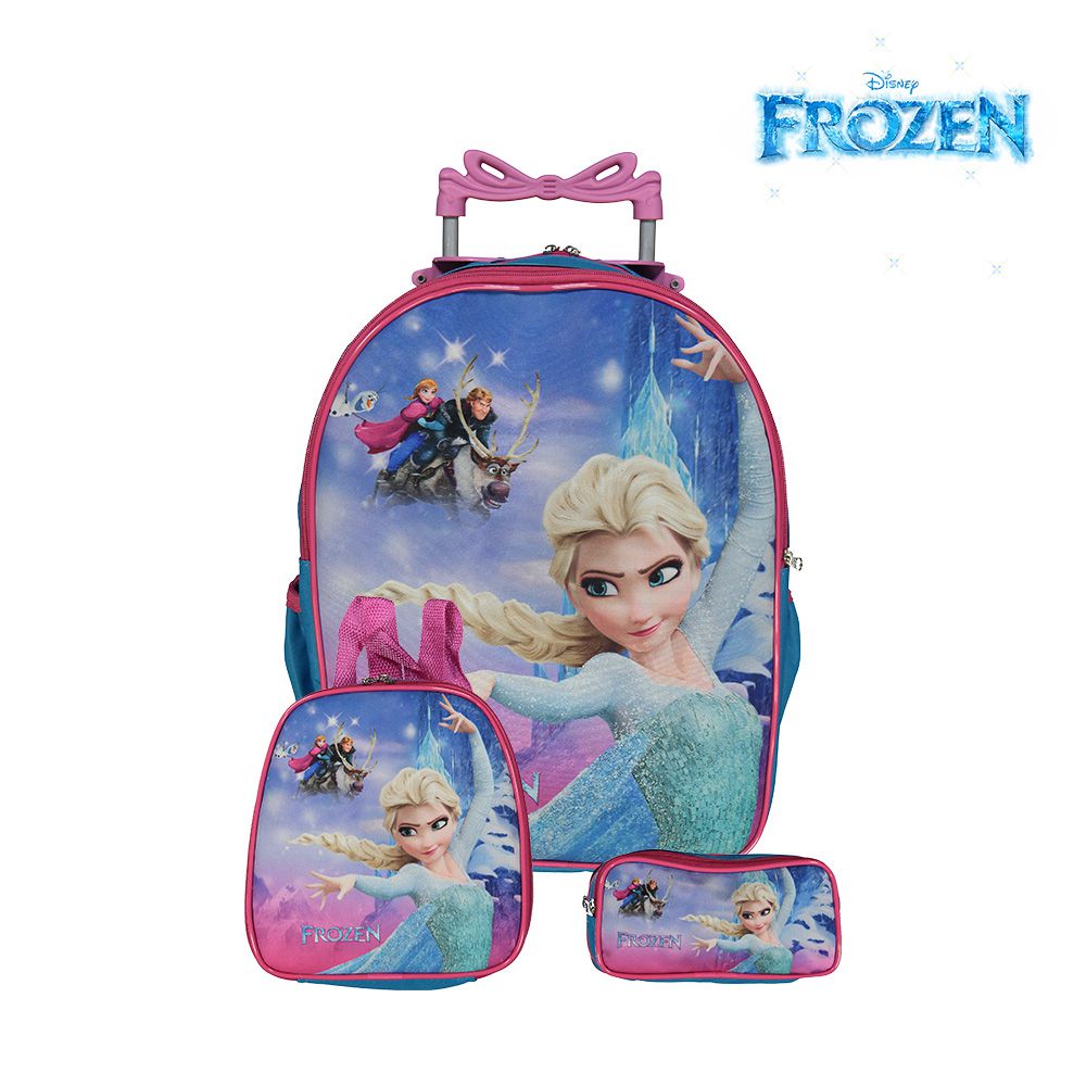 Kit Mochila Infantil Escolar Frozen Com Rodinhas, acompanha lancheira e estojo. Agora você pode levar sua mochila da Frozen no seu dia a dia ou acompanhar você na escola. Possui alça de mão reforçada. Sua abertura maior se dá por zíper com puxador. Na parte de dentro possui amplo espaço para a guardar diversos materiais como cadernos, livros e estojos. Na parte da frente, possui bolso com zíper para a guardar pertences de menor tamanho, e bolsos laterais.