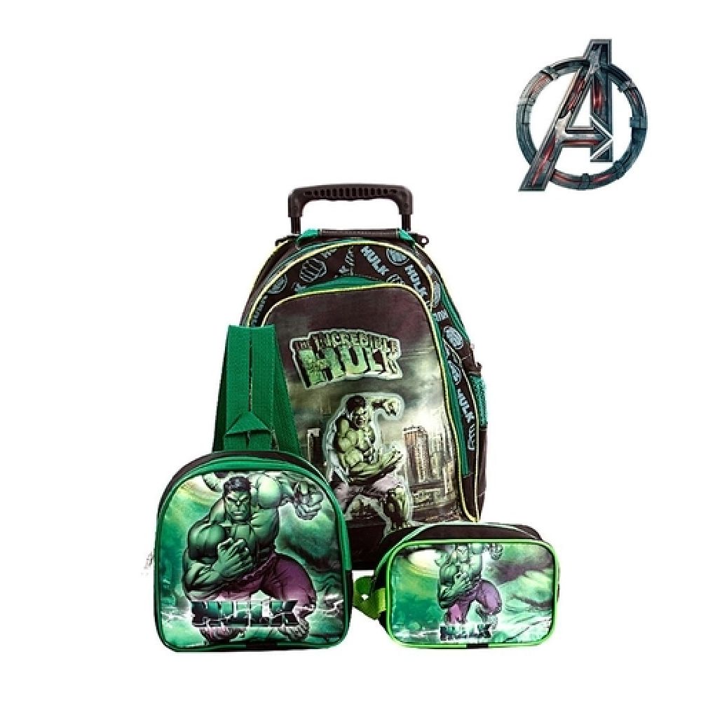 Kit Mochila Infantil Escolar Hulk Com Rodinha, acompanha lancheira, estojo. Você agora pode levar sua mochila do Hulk no seu dia a dia ou acompanhar você na escola.