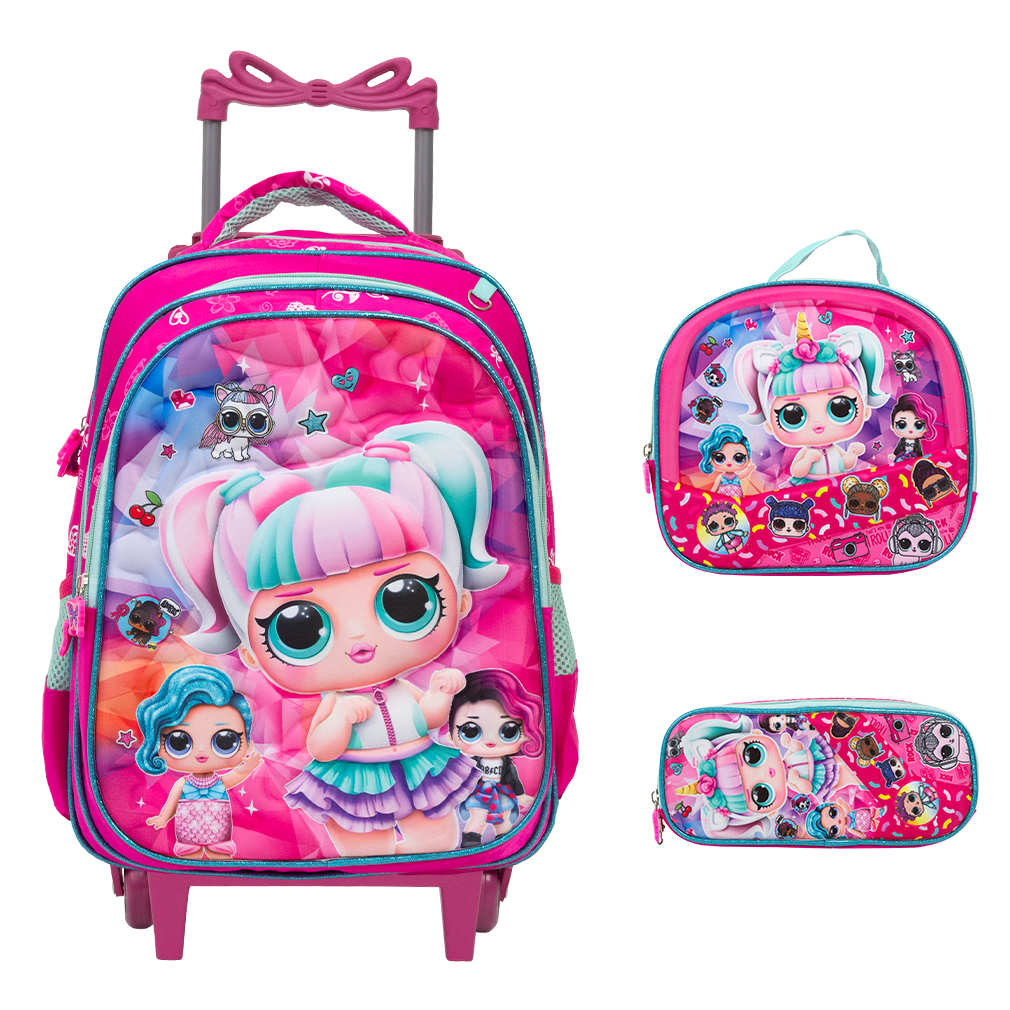 Kit Mochila Escolar Infantil Lol Surprise Com Rodinhas, acompanha lancheira e estojo. Agora pode levar sua mochila no seu dia a dia ou acompanhar você na escola. Possui alça de mão reforçada. Sua abertura maior se dá por zíper com puxador. Na parte de dentro possui amplo espaço para a guardar diversos materiais como cadernos, livros e estojos. Na parte da frente, possui bolso com zíper para a guardar pertences de menor tamanho, e bolsos laterais.