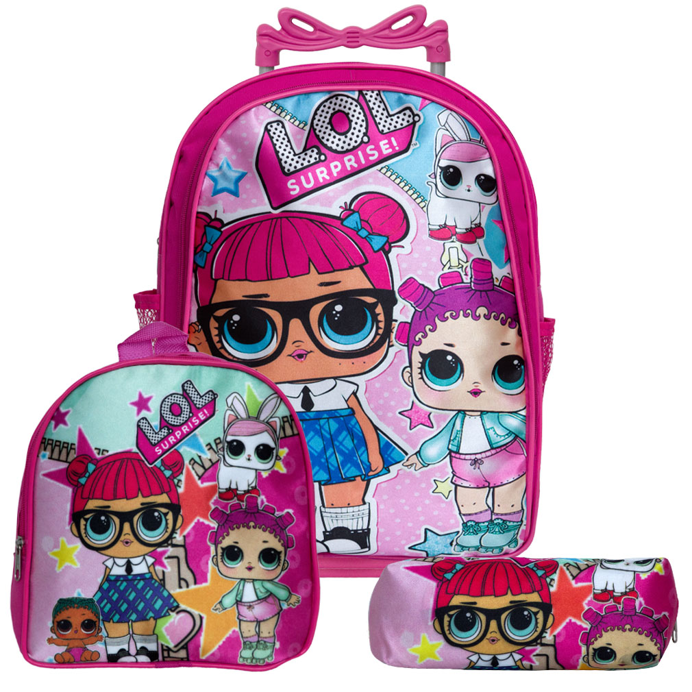 Kit Mochila Infantil Escolar Lol Surprise Com Rodinha, acompanha lancheira e estojo. Você agora pode levar sua mochila da Lol Surprise no seu dia a dia ou acompanhar você na escola.