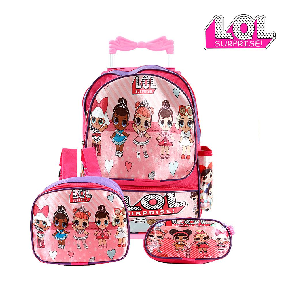 Kit Mochila Escolar Lol Surprise Com Rodinhas, acompanha lancheira e estojo. Agora você pode levar sua mochila da Lol Surprise no seu dia a dia ou acompanhar você na escola. Possui alça de mão reforçada. Sua abertura maior se dá por zíper com puxador. Na parte de dentro possui amplo espaço para a guardar diversos materiais como cadernos, livros e estojos. Na parte da frente, possui bolso com zíper para a guardar pertences de menor tamanho, e bolsos laterais.