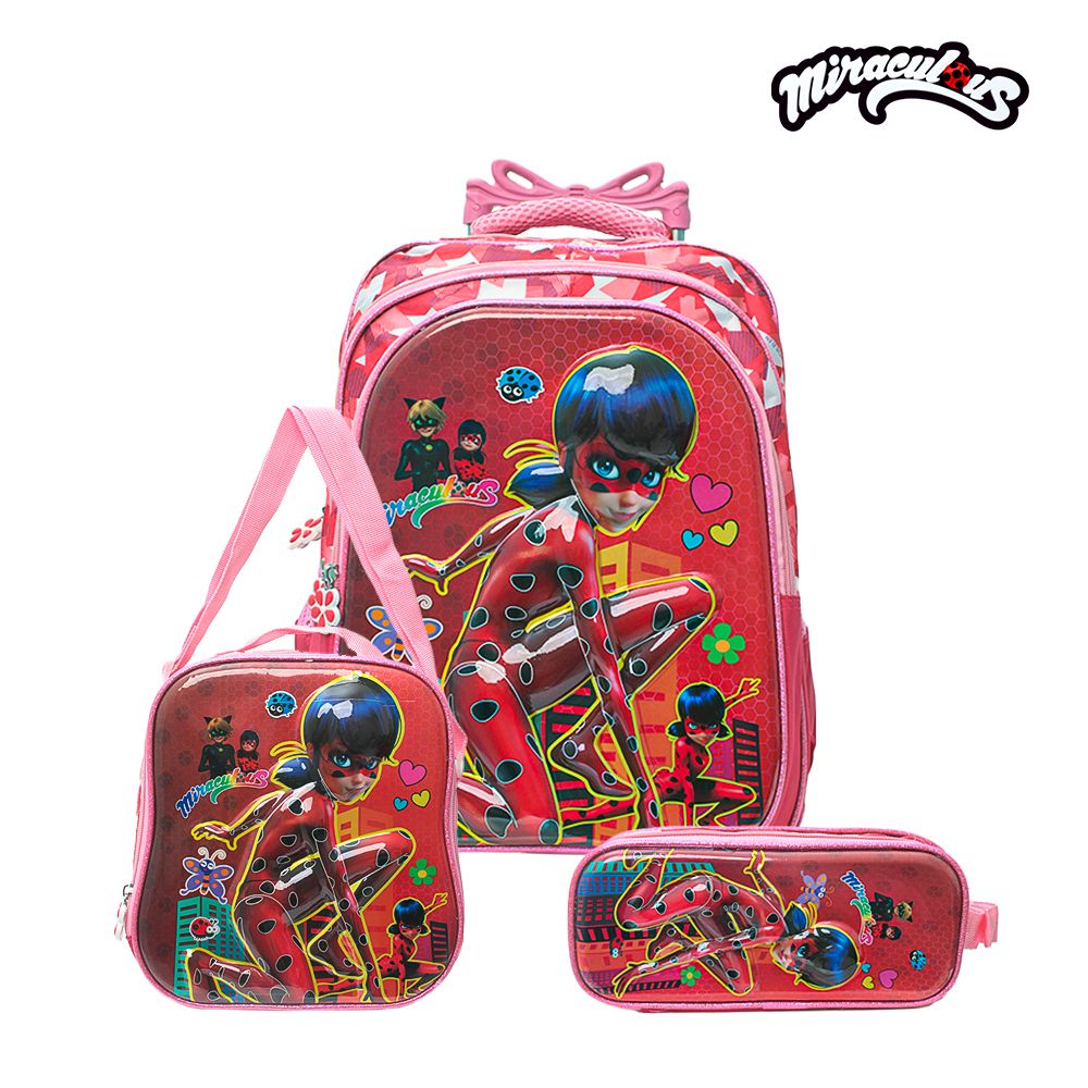 Kit Mochila Infantil Escolar Miraculous 3D Ladybug Com Rodinhas, acompanha lancheira e estojo. Agora você pode levar sua mochila da Miraculous no seu dia a dia ou acompanhar você na escola. Possui alça de mão reforçada. Sua abertura maior se dá por zíper com puxador. Na parte de dentro possui amplo espaço para guardar diversos materiais como cadernos grandes, livros e estojos. Na parte da frente, possui bolso com zíper para guardar pertences de menor tamanho, e bolsos laterais.