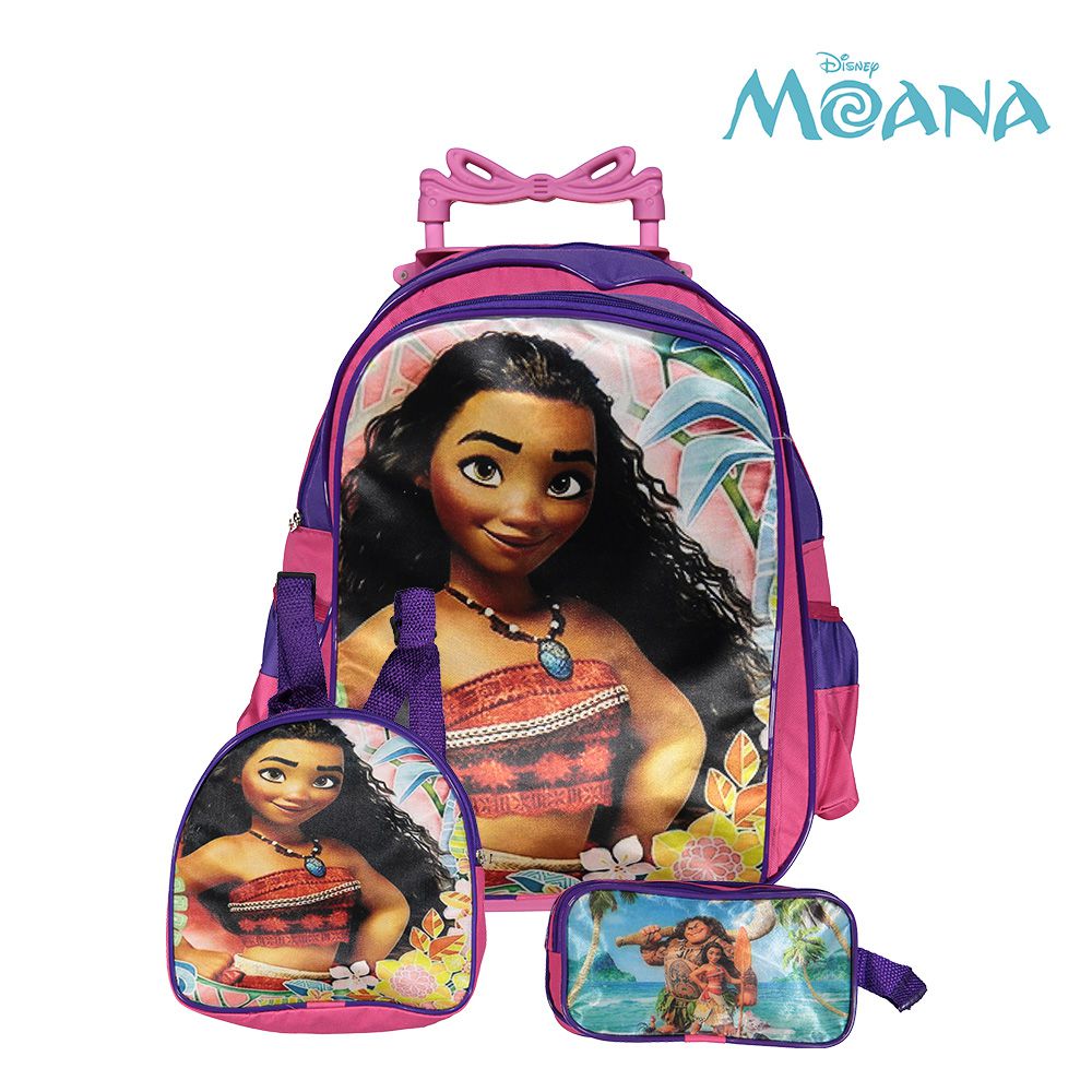 Kit Mochila Infantil Escolar Moana Com Rodinhas, acompanha lancheira e estojo. Agora você pode levar sua mochila da Moana no seu dia a dia ou acompanhar você na escola. Possui alça de mão reforçada. Sua abertura maior se dá por zíper com puxador. Na parte de dentro possui amplo espaço para a guardar diversos materiais como cadernos, livros e estojos. Na parte da frente, possui bolso com zíper para a guardar pertences de menor tamanho, e bolsos laterais.