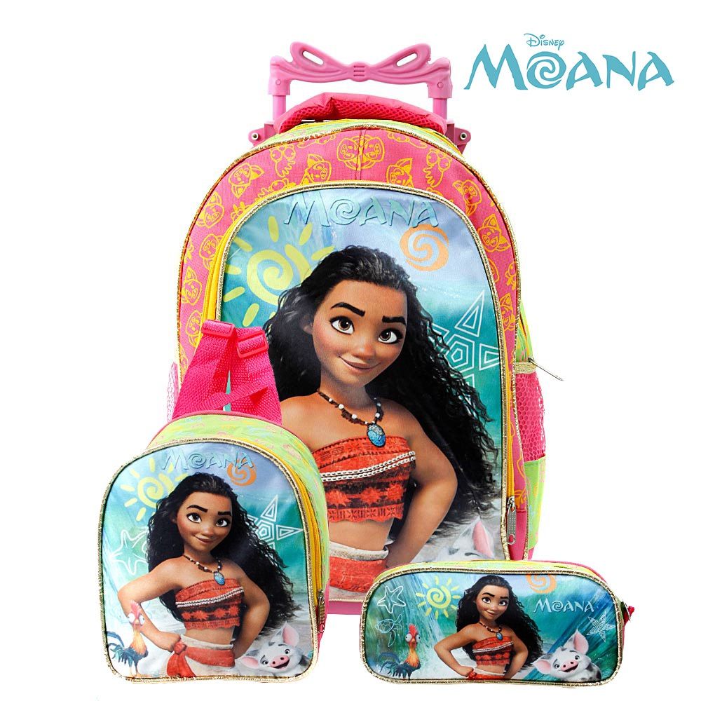 mochila, escola, escolar, meninas, infantil, rodinha, personagem, desenho, moana, maui, mar de aventuras, disney, princesas, oceano.