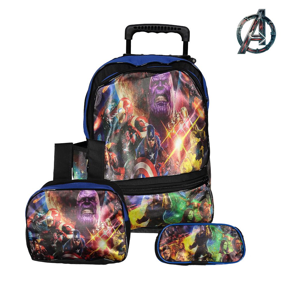 Kit Mochila Infantil Escolar Vingadores Avengers Marvel Com Rodinha. Agora você pode levar sua mochila Dos Vingadores no seu dia a dia ou acompanhar você na escola. Possui alça de mão reforçada. Sua abertura maior se dá por zíper com puxador. Na parte de dentro possui amplo espaço para a guardar diversos materiais como cadernos, livros e estojos. Na parte da frente, possui bolso com zíper para a guardar pertences de menor tamanho, e bolsos laterais.