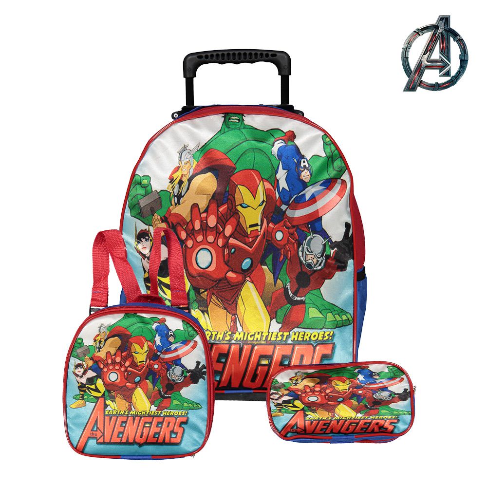 Kit Mochila Infantil Escolar Vingadores Marvel Com Rodinha. Agora você pode levar sua mochila Dos Vingadores no seu dia a dia ou acompanhar você na escola. Possui alça de mão reforçada. Sua abertura maior se dá por zíper com puxador. Na parte de dentro possui amplo espaço para a guardar diversos materiais como cadernos, livros e estojos. Na parte da frente, possui bolso com zíper para a guardar pertences de menor tamanho, e bolsos laterais.