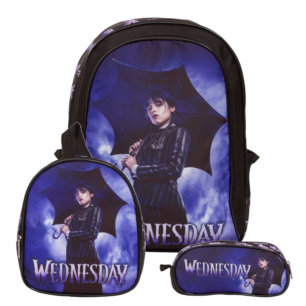 Kit Mochila Escolar Infantil Wandinha, acompanha lancheira e estojo. Possui alça de mão reforçada. Agora você pode levar sua mochila no seu dia a dia ou acompanhar você na escola. Sua abertura maior se dá por zíper com puxador. Na parte de dentro possui amplo espaço para a guardar diversos materiais como cadernos, livros e estojos. Na parte da frente, possui bolso com zíper para a guardar pertences de menor tamanho e bolsos laterais.
