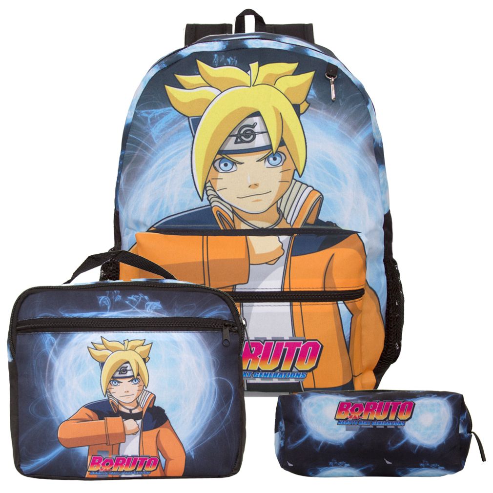 Kit Mochila Escolar Infantil Boruto, acompanha lancheira e estojo. Possui alça de mão reforçada. Agora você pode levar sua mochila no seu dia a dia ou acompanhar você na escola. Sua abertura maior se dá por zíper com puxador. Na parte de dentro possui amplo espaço para a guardar diversos materiais como cadernos, livros e estojos. Na parte da frente, possui bolso com zíper para a guardar pertences de menor tamanho e bolsos laterais.