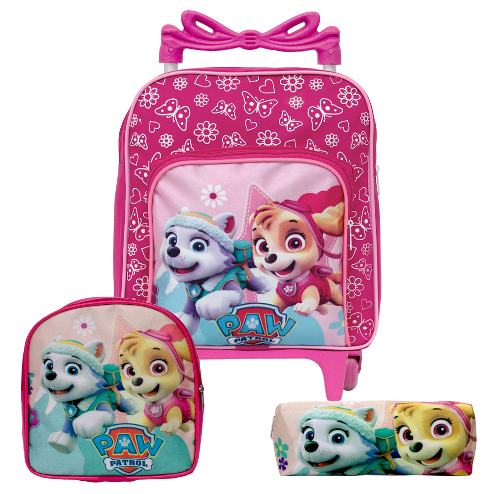 Kit Mochila Pequena Escolar Infantil Patrulha Canina Rosa Com Rodinhas, acompanha lancheira e estojo. Agora você pode levar sua mochila do Patrulha Canina no seu dia a dia ou acompanhar você na escola.