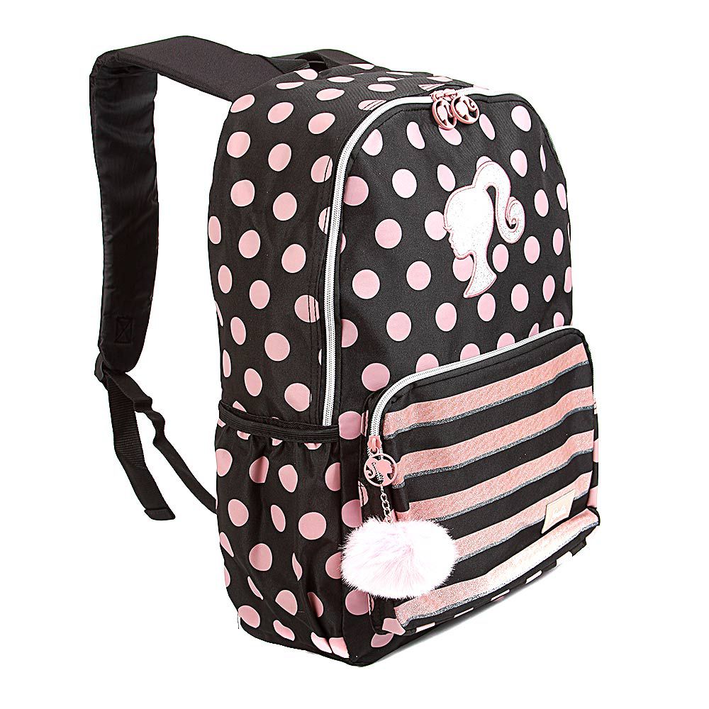Mochila Barbie Bolinhas Preto e Rosa com Pompom de Costa. Agora você pode levar sua mochila Barbie no seu dia a dia ou acompanhar você na escola. Possui alça de mão reforçada. Sua abertura maior se dá por zíper com puxador personalizado. Na parte de dentro possui amplo espaço para guardar diversos materiais como cadernos grandes, livros e estojos. Na parte da frente, possui bolso com zíper personalizado para guardar pertences de menor tamanho.
