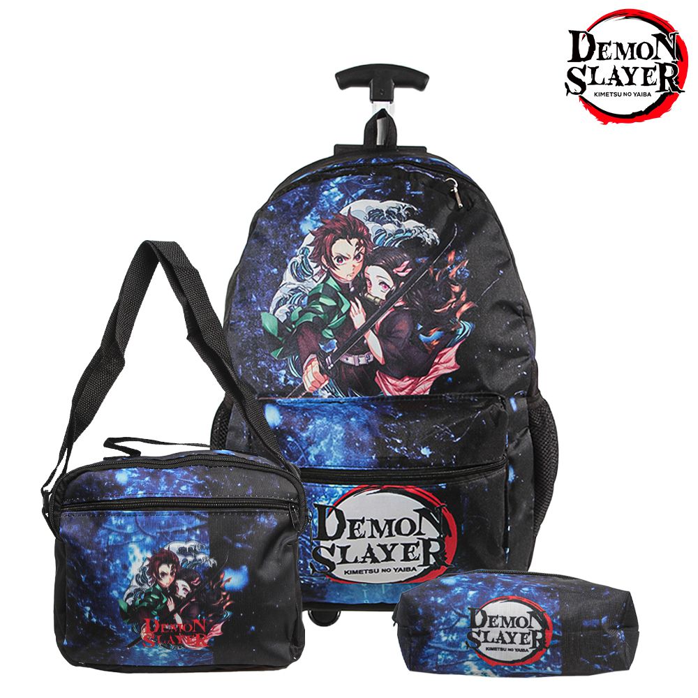 Kit Mochila Escolar Infantil Demon Slayer Rodinhas, acompanha lancheira e estojo. Agora pode levar sua mochila no seu dia a dia ou acompanhar você na escola. Possui alça de mão reforçada. Sua abertura maior se dá por zíper com puxador. Na parte de dentro possui amplo espaço para a guardar diversos materiais como cadernos, livros e estojos. Na parte da frente, possui bolso com zíper para a guardar pertences de menor tamanho, e bolsos laterais.
