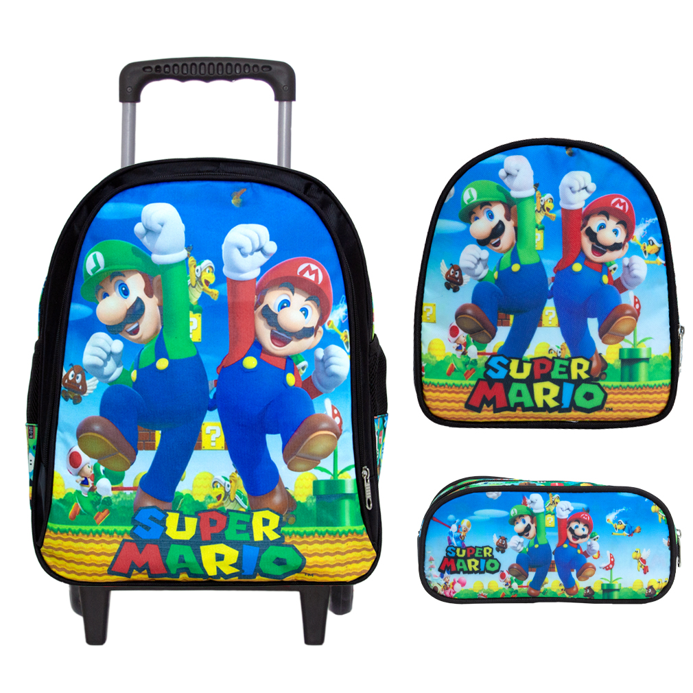 Kit Mochila Escolar Infantil Mario Bross Com Rodinhas, acompanha lancheira e estojo. Agora você pode levar sua mochila do Mario Bross no seu dia a dia ou acompanhar você na escola. Possui alça de mão reforçada. Sua abertura maior se dá por zíper com puxador. Na parte de dentro possui amplo espaço para guardar diversos materiais como cadernos grandes, livros e estojos. Na parte da frente, possui bolso com zíper para guardar pertences de menor tamanho, e bolsos laterais.