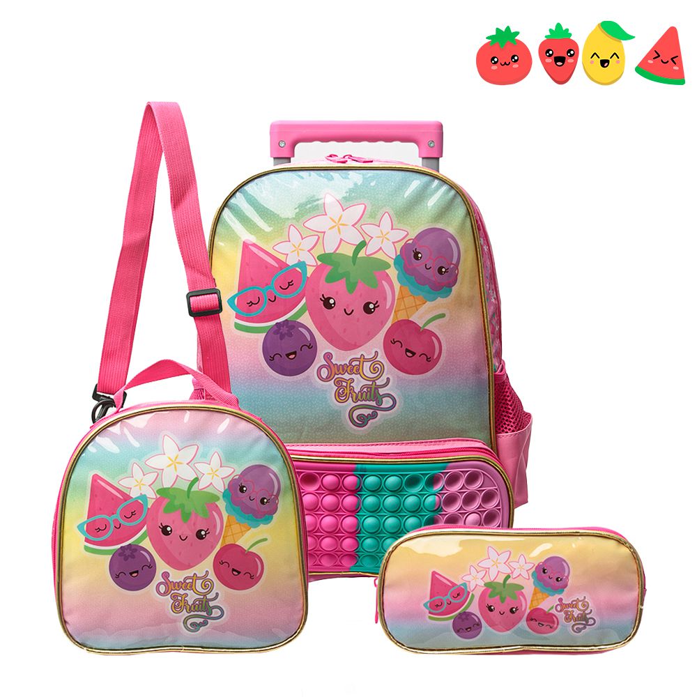 mochila, escola, escolar, meninos, infantil, rodinha, personagem, desenho, jogo, frutas, doces, sweet fruits, jogo pop it, anti stress, relaxante, morango, moranguinho, melanciaa