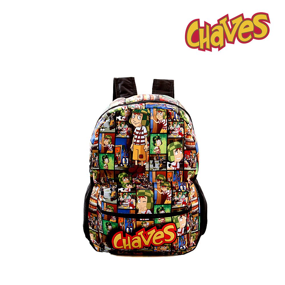 Mochila Escolar Juvenil Do Chaves de Costas. Possui alça de mão reforçada, sua abertura maior se dá por zíper com puxador. Na parte de dentro possui amplo espaço para a guardar diversos materiais como cadernos, livros e estojos. Na parte da frente, possui bolso com zíper para a guardar pertences de menor tamanho e bolsos laterais.