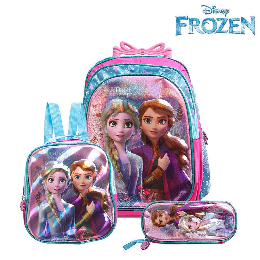 Kit Mochila Escolar Infantil Frozen Rodinhas, acompanha lancheira e estojo. Agora pode levar sua mochila no seu dia a dia ou acompanhar você na escola. Possui alça de mão reforçada. Sua abertura maior se dá por zíper com puxador. Na parte de dentro possui amplo espaço para a guardar diversos materiais como cadernos, livros e estojos. Na parte da frente, possui bolso com zíper para a guardar pertences de menor tamanho, e bolsos laterais.