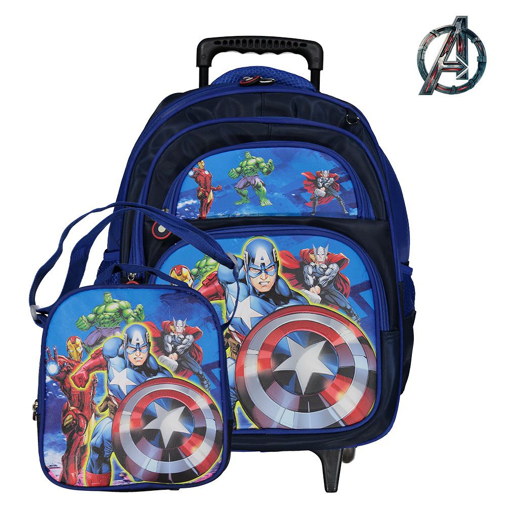 Mochila Escolar Infantil Capitão América Vingadores Marvel de Rodinhas, acompanha lancheira. Agora você pode levar sua mochila dos Vingadores no seu dia a dia ou acompanhar você na escola. Possui alça de mão reforçada. Sua abertura maior se dá por zíper com puxador. Na parte de dentro possui amplo espaço para a guardar diversos materiais como cadernos, livros e estojos. Na parte da frente, possui bolso com zíper para a guardar pertences de menor tamanho, e bolsos laterais.