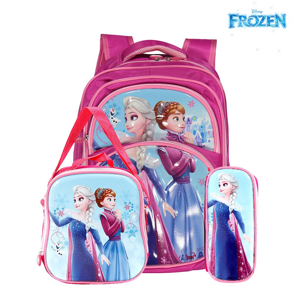 Kit Mochila Escolar Infantil Elsa e Anna Frozen De Costas, acompanha lancheira e estojo. Agora você pode levar sua mochila da Frozen no seu dia a dia ou acompanhar você na escola. Possui alça de mão reforçada. Sua abertura maior se dá por zíper com puxador. Na parte de dentro possui amplo espaço para guardar diversos materiais como cadernos grandes, livros e estojos. Na parte da frente, possui bolso com zíper para guardar pertences de menor tamanho, e bolsos laterais
