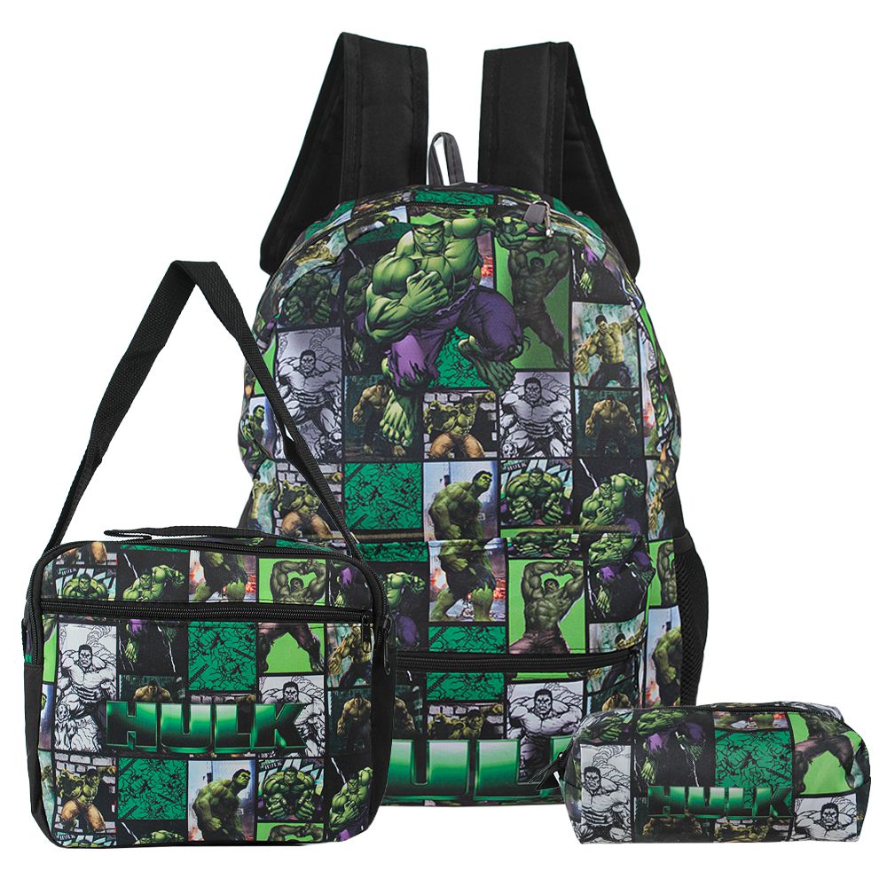 Kit Mochila Escolar Infantil Incrível Hulk Costas, acompanha lancheira e estojo. Possui alça de mão reforçada. Agora você pode levar sua mochila no seu dia a dia ou acompanhar você na escola. Sua abertura maior se dá por zíper com puxador. Na parte de dentro possui amplo espaço para a guardar diversos materiais como cadernos, livros e estojos. Na parte da frente, possui bolso com zíper para a guardar pertences de menor tamanho.